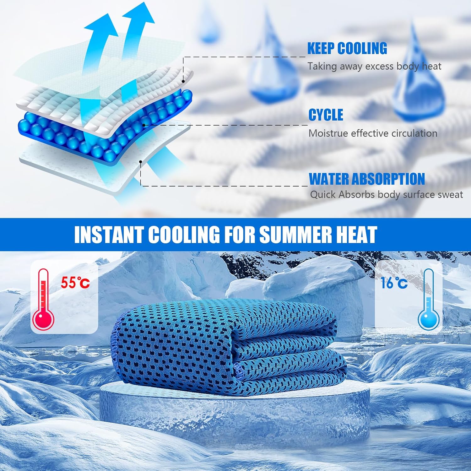 SOFT & COMFORTABLE:The cooling towels for neck and face is designed to absorb moisture and sweat to keep you dry during high-intensity exercise. Cold towels are also easy to hang around the neck or shoulders and can be used as a hood, sweatband, cooling bandana, neck gaiter or scarf