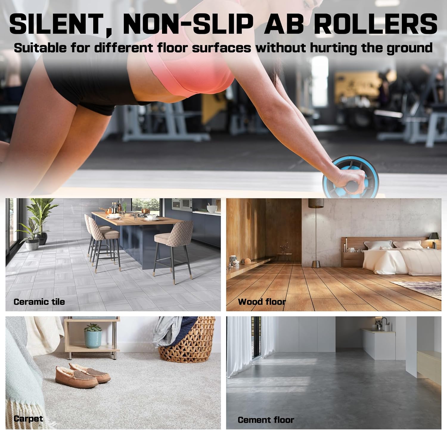 【Silent & Non-slip】Our abs roller workout equipment, using non-slip rollers, with super friction, not easy to slip, while using a silent design does not hurt the floor and carpet, gel cotton handle, comfortable grip, to protect your hands, and more sweat-absorbent