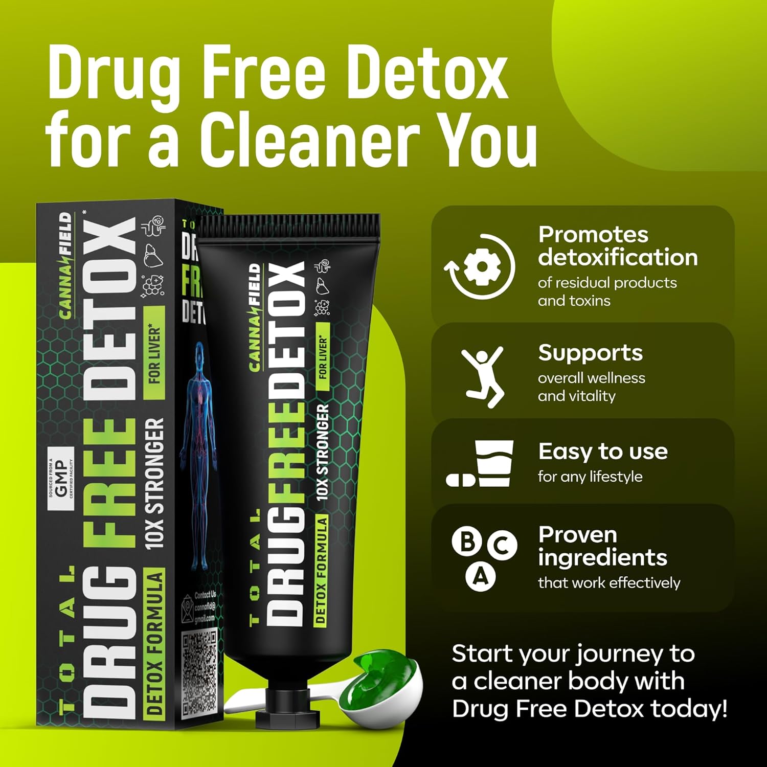 Reliable and Efficient Detox – Experience a thorough method with Cannafield Detox Gel, a solution to aid your body’s innate detoxification process. Our latest formula is crafted to deliver a complete system cleanse, revitalizing your body internally. This gel is meticulously formulated with premium components to guarantee both safety and effectiveness. Regain your emotional well-being with our specially formulated cleaner detox gel.