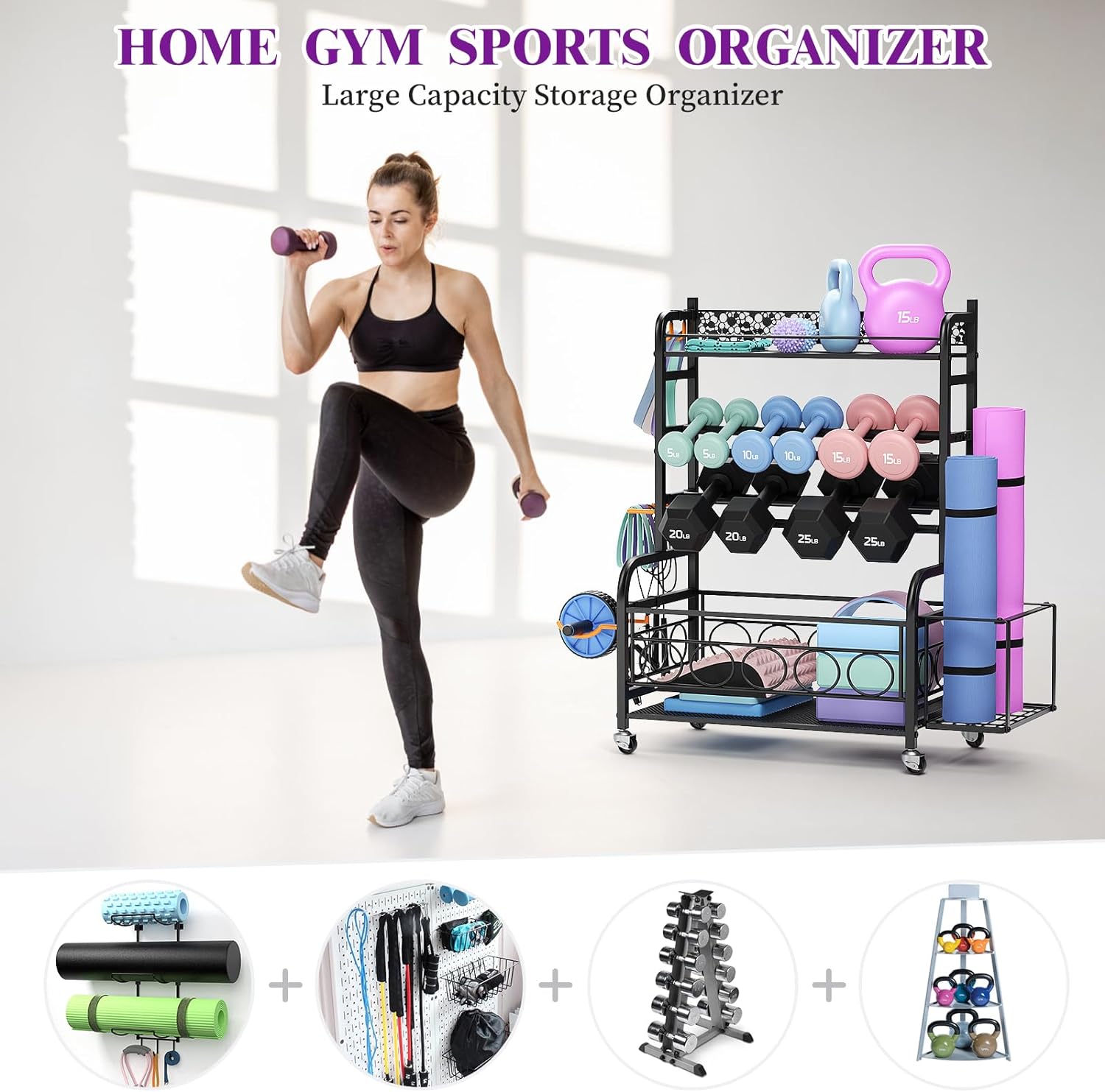 Large Home Gym Storage Rack: This multi-functional weight rack is equipped with top metal layer for kettlebells, 2-layer dumbbell rack, bottom metal storage basket, a side basket for yoga mat and foam rollers, Several side hooks for fitness bands and rollers. Perfect for organizing your various gym equipment into one storage rack, easy to organize your space and stay organized