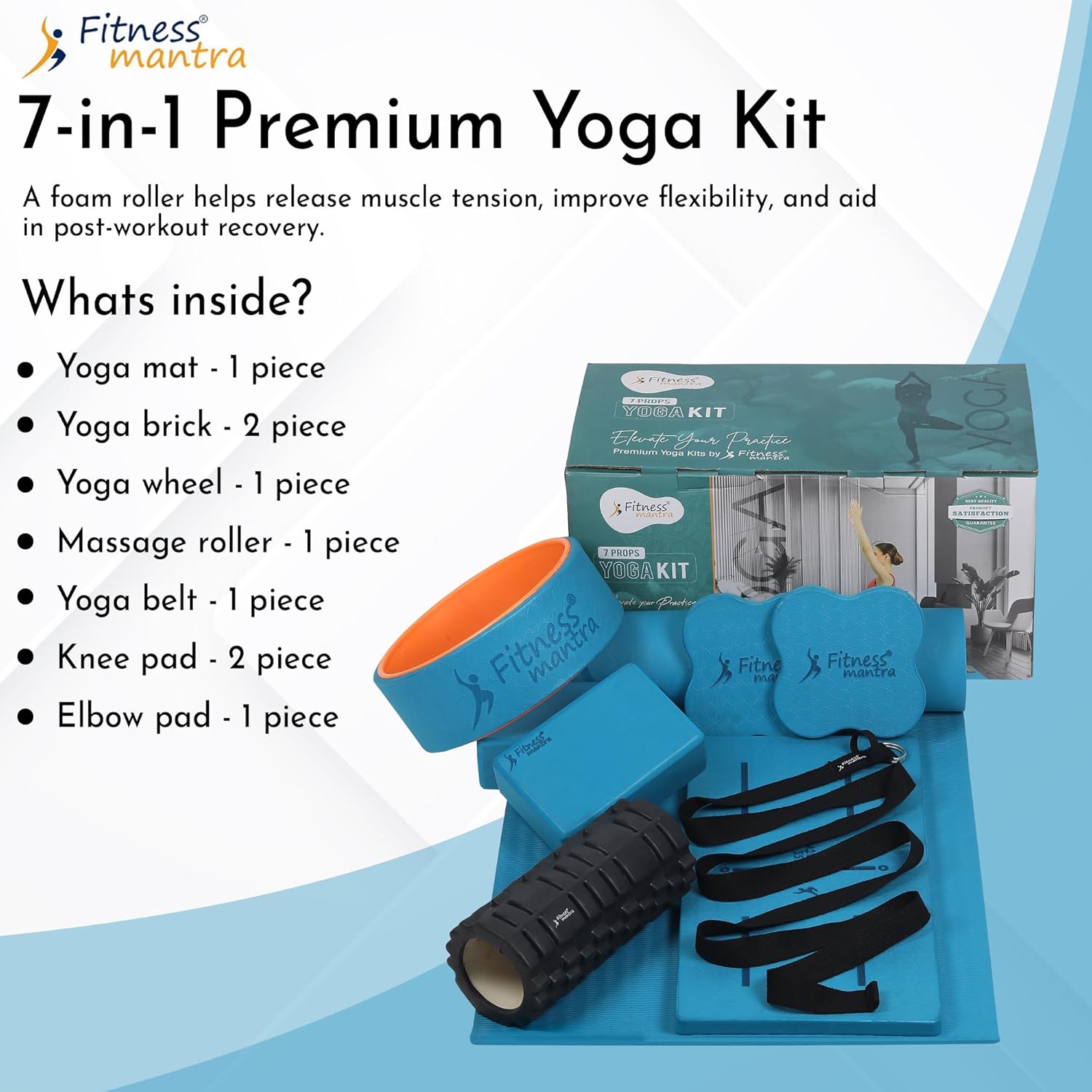 Fitness Mantra® 7 Props Yoga Kit| 1N TPE Yoga Mat, 1N Yoga Wheel, 1N Massage Roller, 1N Knee Pad, 1N Yoga Belt| 2N Yoga Bricks, 2N Elbow Pad|