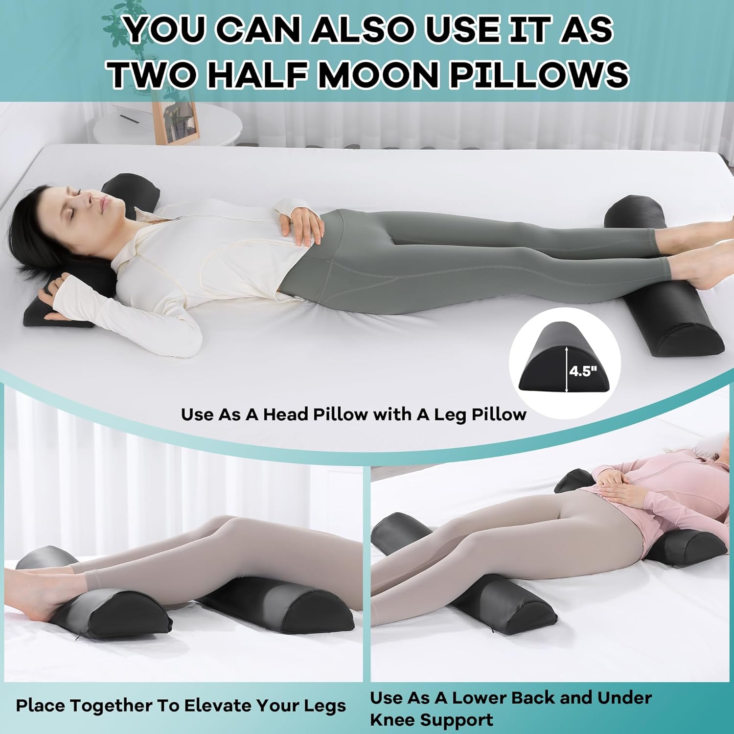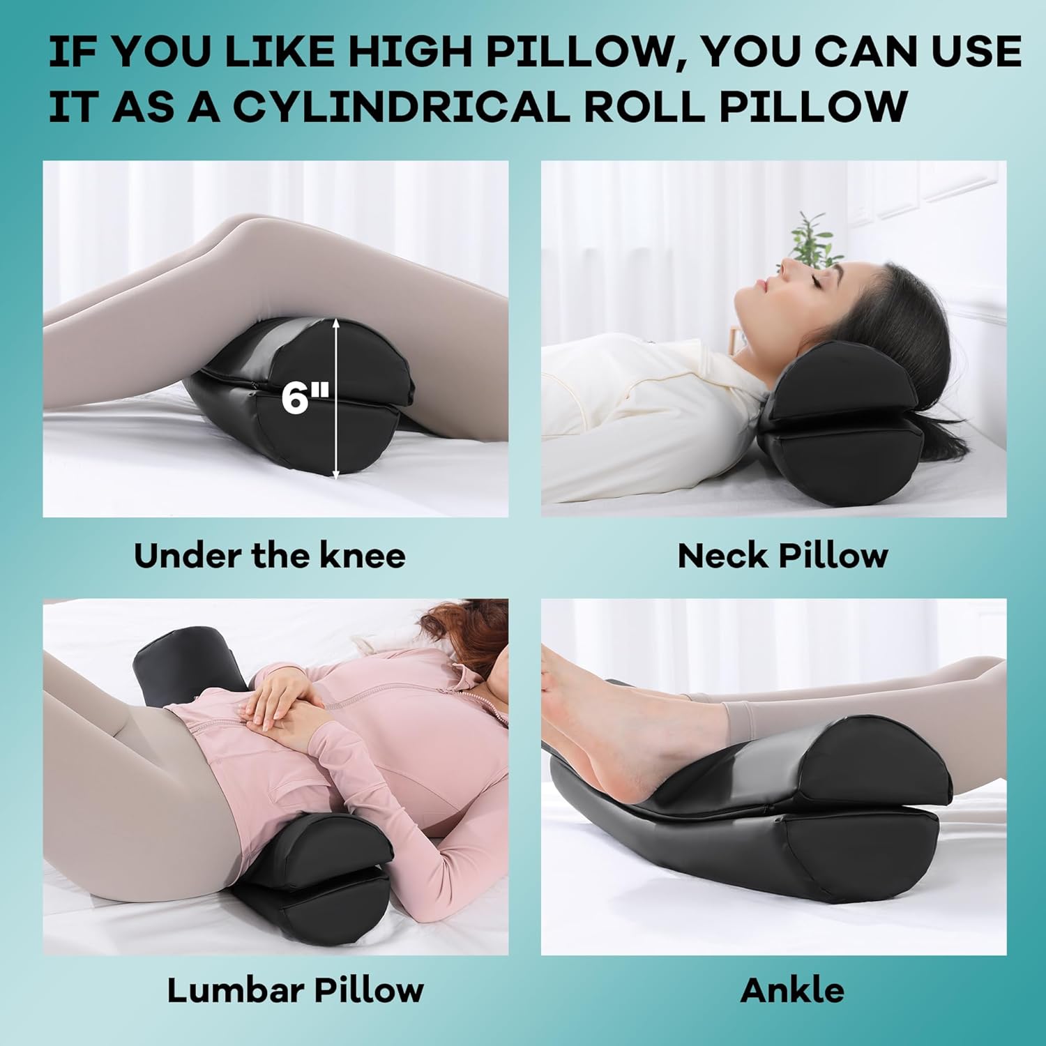 Detachable Multifunctional Design: This round massage bolster pillow can be detached into 2 half-moon pillows (use hook and loop to combine or separate) to support any two parts of the neck, waist and ankles at the same time. In addition to massage, it is also very suitable for sleeping and resting.