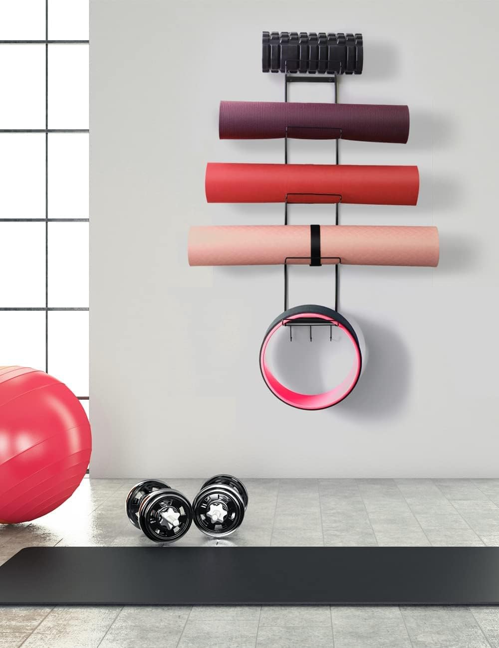 𝐌𝐚𝐤𝐞 𝐘𝐨𝐮𝐫 𝐇𝐨𝐦𝐞 𝐆𝐲𝐦 𝐎𝐫𝐠𝐚𝐧𝐢𝐳𝐞𝐝! – The 5-tier storage rack can hold a variety of yoga mats, foam rollers, yoga blocks and yoga wheels, and the 3-hook can hang most yoga accessories like resistance bands, stretching straps, jumping ropes, and more. Keep your yoga studio or home gym organized and no more messy yoga supplies on the floor with this wall mounted storage rack