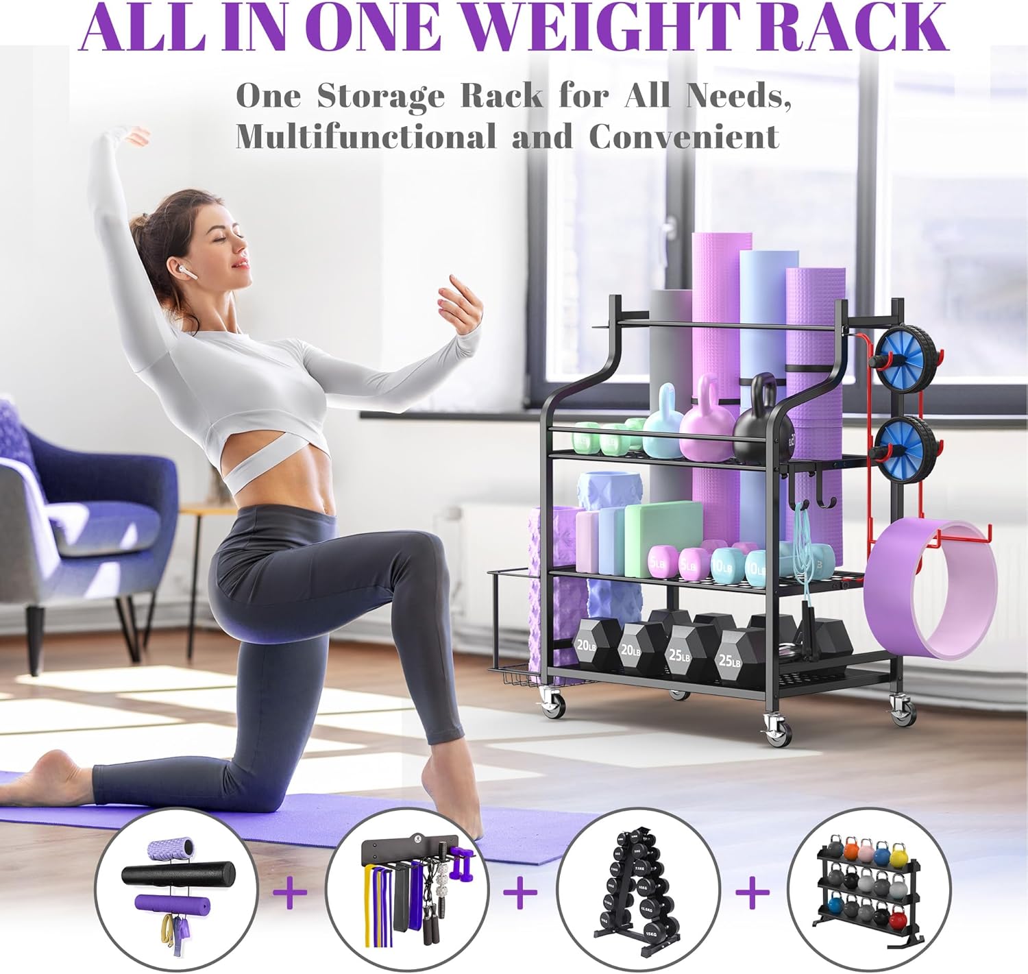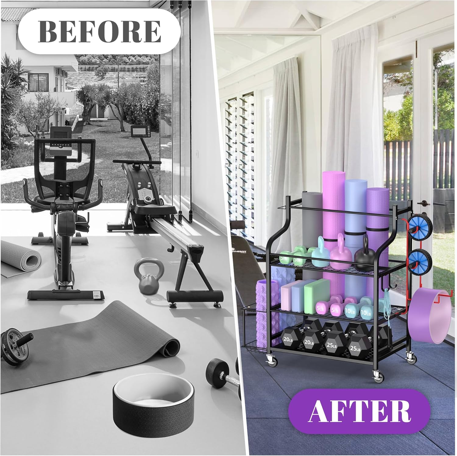 Mythinglogic Yoga Mat Storage Racks,Home Gym Storage Rack for Dumbbells Kettlebells Foam Roller, Yoga Strap and Resistance Bands, Workout Equipment Storage Organizer With Hooks and Wheels