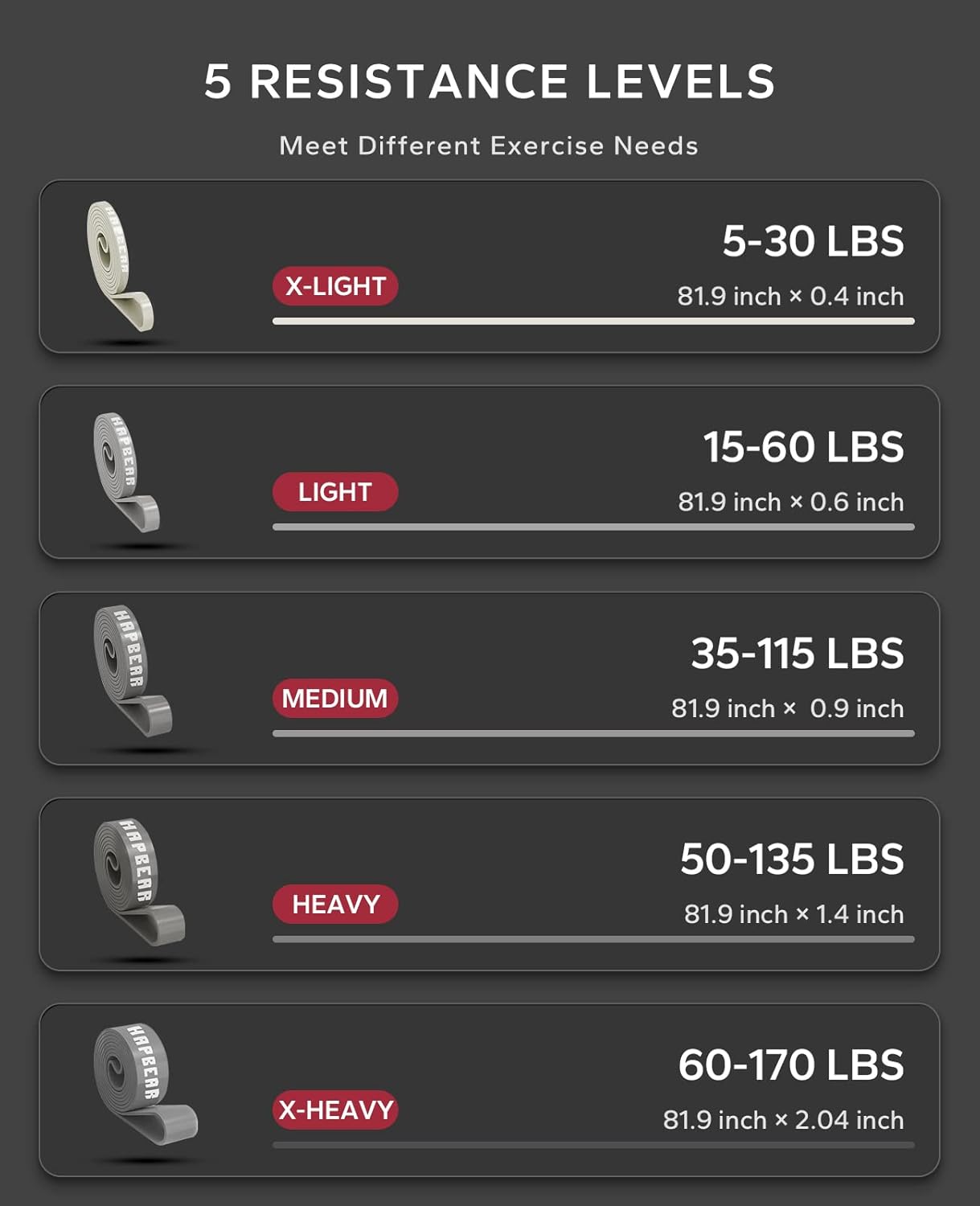 【5 Pcs with Varying Resistance Levels】Our pull up assistance bands comes with 5 resistance levels, which increase in layers, and you can switch combinations freely. X-LIGHT: 5-30 LBS, LIGHT: 15-60 LBS, MEDIUM: 35-110 LBS, HEAVY: 50-135 LBS, X-HEAVY: 60-170 LBS. The avant-garde and fashionable gray gradient colors will bring you a completely different experience in vision and use.